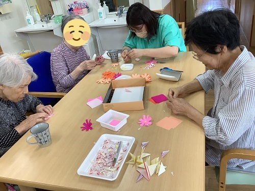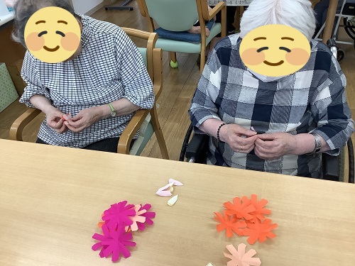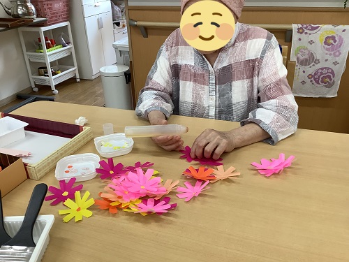コスモスの花を色紙で折って、切って、広げていただきます。