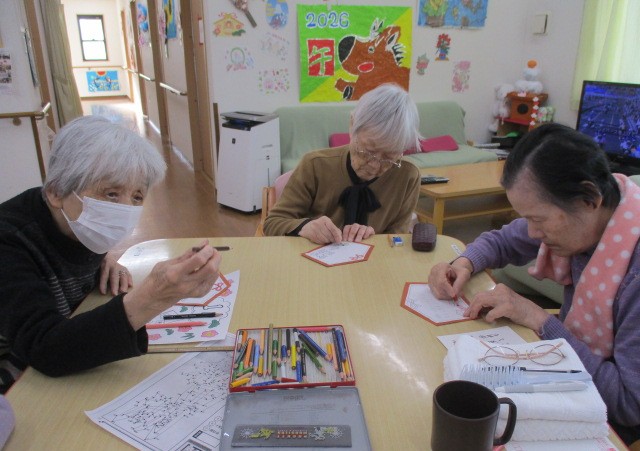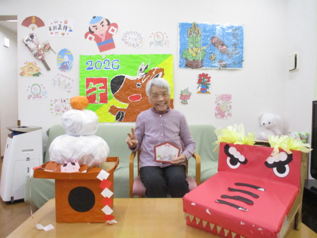 入居者皆様で作り上げた正月飾りの前で記念撮影です。