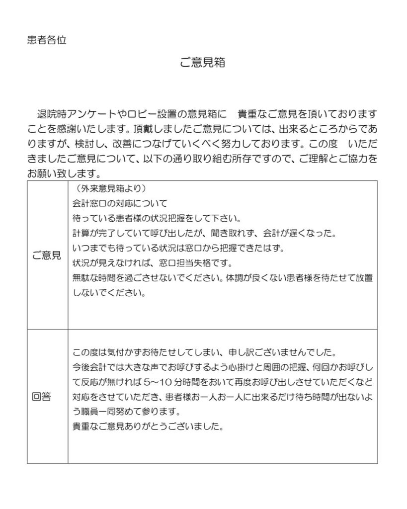 退院時アンケートやロビー設置の意見箱に、貴重なご意見を頂いておりますことを感謝いたします。