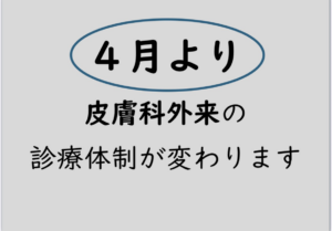 4月より皮膚科外来診療体制が変わります 2026年3月13日4月より皮膚科外来の診療体制が変わります。○令和8年3月まで 月曜日・金曜日 (受付時間) 8:30~11:30○令和8年4月から 月曜日のみ (受付時間) 8:30~11:30