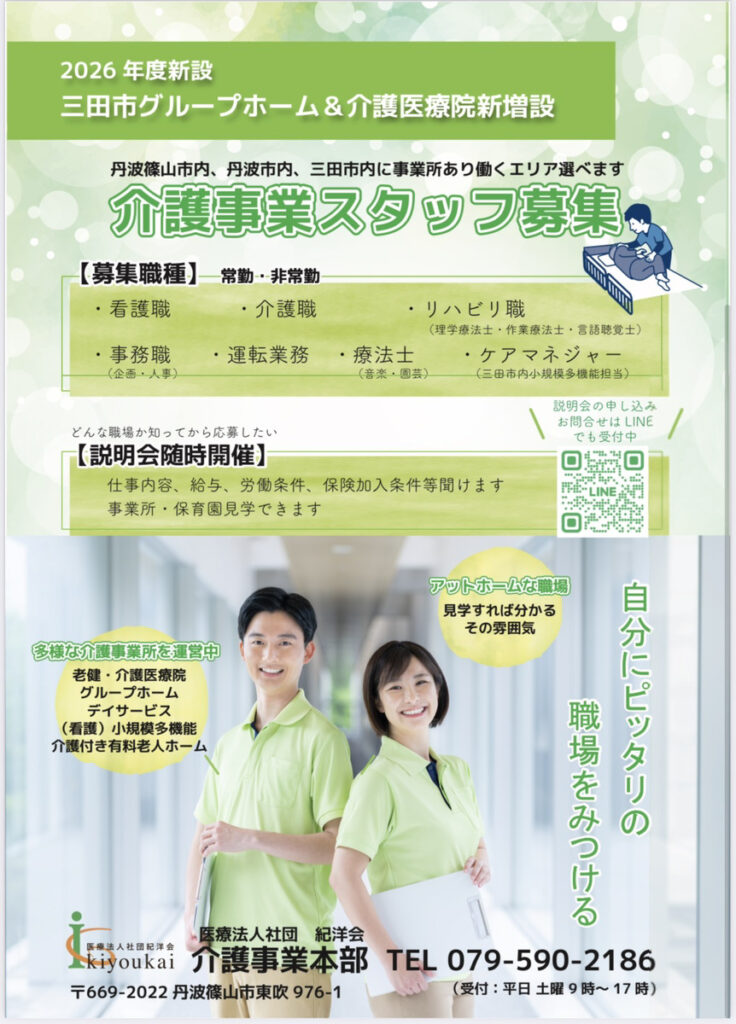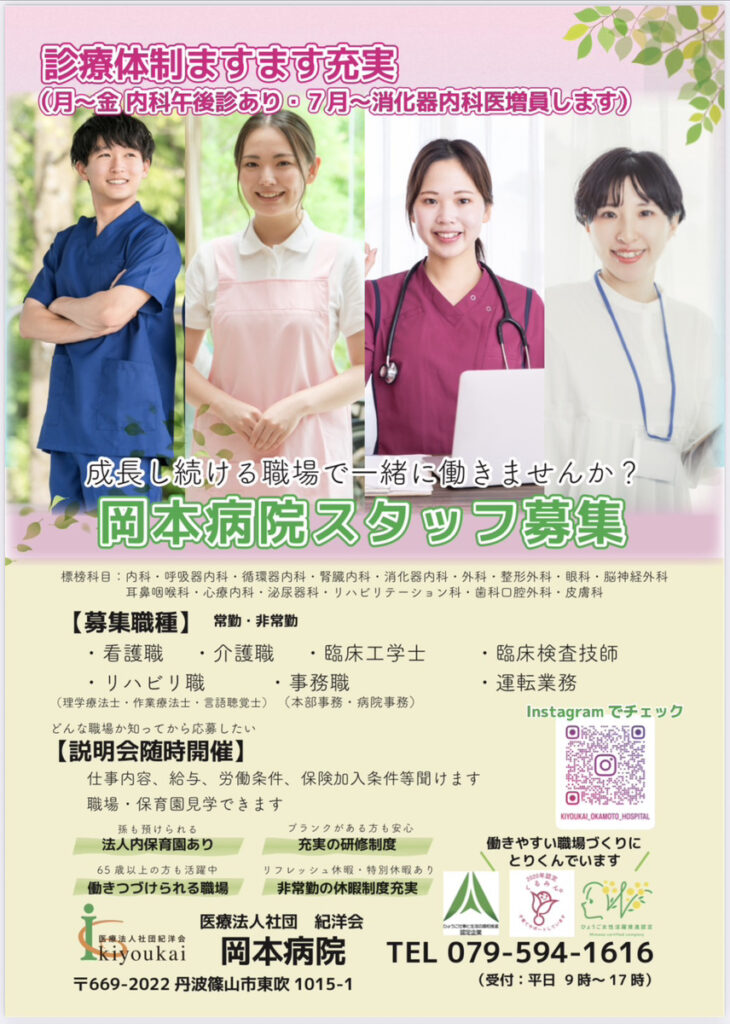 求人情報 2026年4月7日岡本病院と介護事業所の求人情報を掲載します。気軽にお問合せください。 (病院情報) (介護事業所求人情報)同時募集!三田市新設グループホーム&丹波篠山市増設介護医療医スタッフ