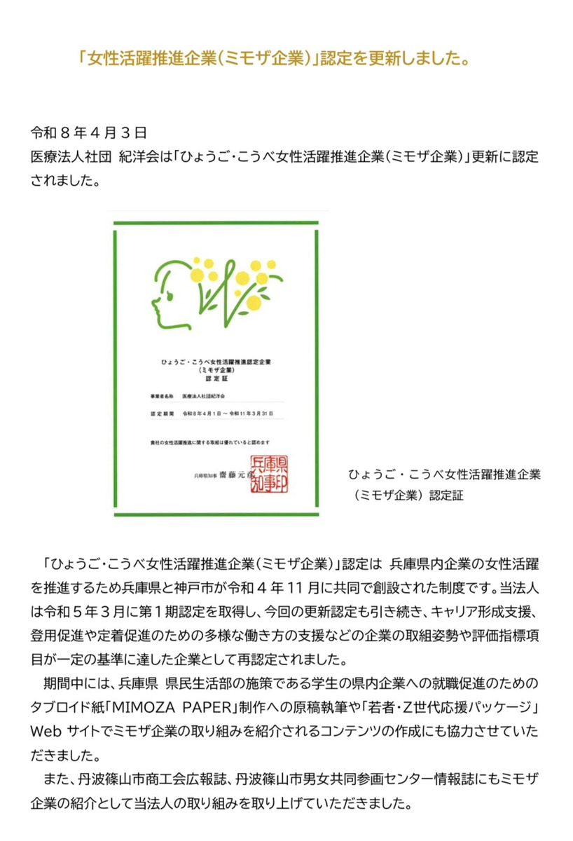 • 「ひょうご・こうべ女性活躍推進企業(ミモザ企業)」に認定されました。