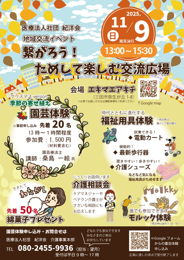 園芸体験・福祉用具体験・綿菓子プレゼント・介護相談会・モルック体験をします。