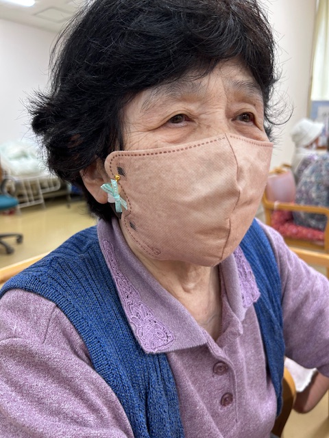 また、ご利用者の女子心をくすぐるアクセサリーを手作りしました。マスクチャームです。襟元にお付けになられたり工夫して楽しんでいただいております。